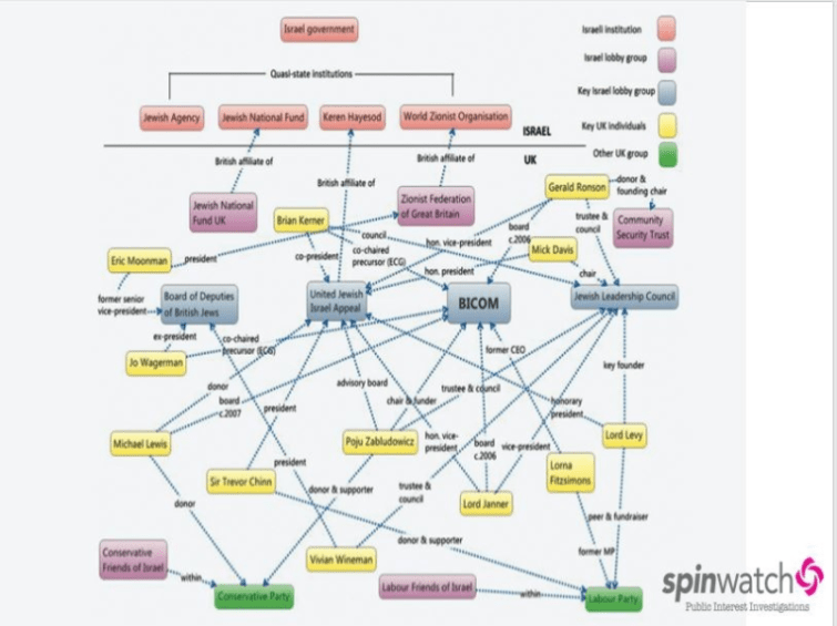 “The problem is that his work constructs a kind of ‘flatland’; a world in which networks of power and influence are so intricately connected that they form a seamless system. Each node that he exposes in this system, each connection that is traced between it and other nodes, is functionally identical to others. What we end up with is a process of progressively revealing a system so overwhelming that the only rational response to its exposure must be despair shot through with liberation. Take Miller’s well known slide from his presentation on how British Jewish / Zionist / Israel lobby institutions are interconnected (reproduced above). While the nodes on this network are differentiated by type (‘Israel institution’, ‘Key UK individuals’ etc) and while the nature of the interconnections are identified (‘donor’, ‘president’ etc), these annotations do not in fact tell us anything meaningful, because there isn’t any meaningful distinction to be made – and that’s the point. That, for example, Mick Davis and Vivian Wineman have been fiercely criticised from the right of the Jewish community for their dovish views on Israel is of no import. That the Board of Deputies and the Zionist Federation are coalitions constantly riven by tension and dispute is not worth remarking on. Zionism / Israel forms a seamless whole. […] Miller’s map of the Zionist flatland grows remorselessly over time. The only way to avoid getting ensnared into it is by renouncing any connection to those who are on the map. […] Those who share Miller’s methodology of guilt by association will always end up progressively writing off whole chunks of humanity until only a small hardcore of enlightened ones is left. While Miller may be a particularly adept exponent of the politics of the flatland, it is not exclusive to him, to the left or to antisemites. We have to acknowledge that the flatland holds its attractions to those of any political disposition. Its mixture of liberation and despair are tempting: You no longer have to grapple with the intricacies of who people are; you are released from the burdens of developing a finely-calibrated politics. All is one; all is either enemy or friend. I suspect that the internet and social media have made the flatland more attractive. It is easy to trace associations, to find meaning in the liking of a tweet or the acceptance of a friend request. Like David Miller we are all tempted to see ‘research’ as the piling up evidence of contacts, rather than an investigation of the nature of those contacts. We can know everything and still know nothing. The alternative is hard: To understand relationships as relationships. There are no shortcuts here.”
