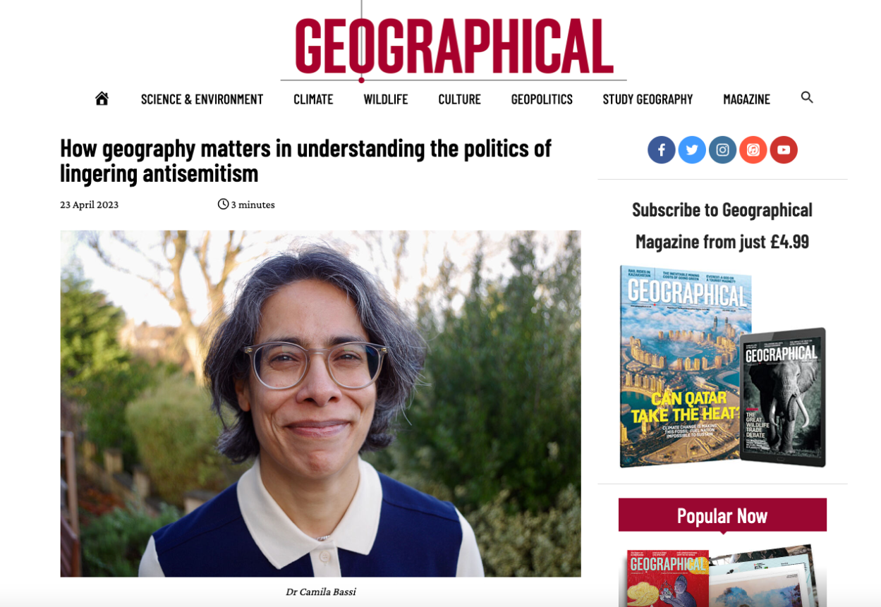Written by camilabassiMay 17, 2023 Geographical: How geography matters in understanding the politics of lingering antisemitism See here for my Geographical magazine piece. Share this: Click to share on X (Opens in new window) X Click to share on Facebook (Opens in new window) Facebook Click to email a link to a friend (Opens in new window) Email Click to print (Opens in new window) Print Like Loading... Related Leave a comment Cancel reply Δ