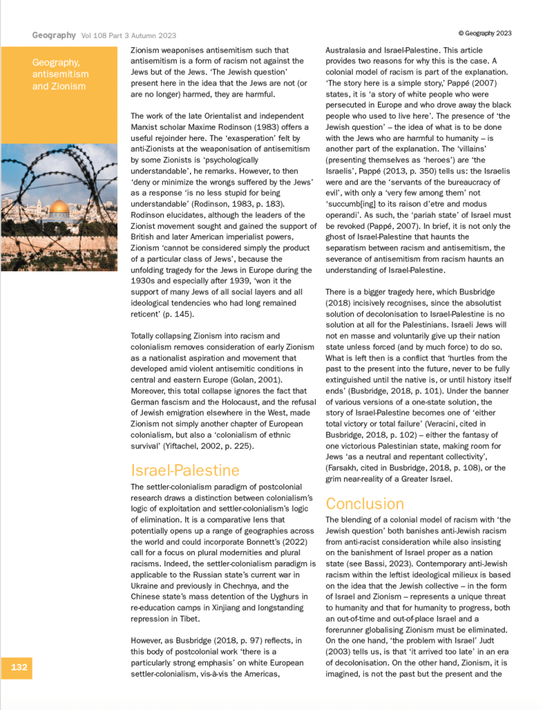 Written by camilabassiNovember 23, 2023November 23, 2023 Geography, antisemitism and Zionism Reference: Camila Bassi (2023) Geography, antisemitism and Zionism, Geography, 108:3, 130-133, DOI: 10.1080/00167487.2023.2260220 Share this: Click to share on X (Opens in new window) X Click to share on Facebook (Opens in new window) Facebook Click to email a link to a friend (Opens in new window) Email Click to print (Opens in new window) Print Like Loading... Related Leave a comment Cancel reply Δ