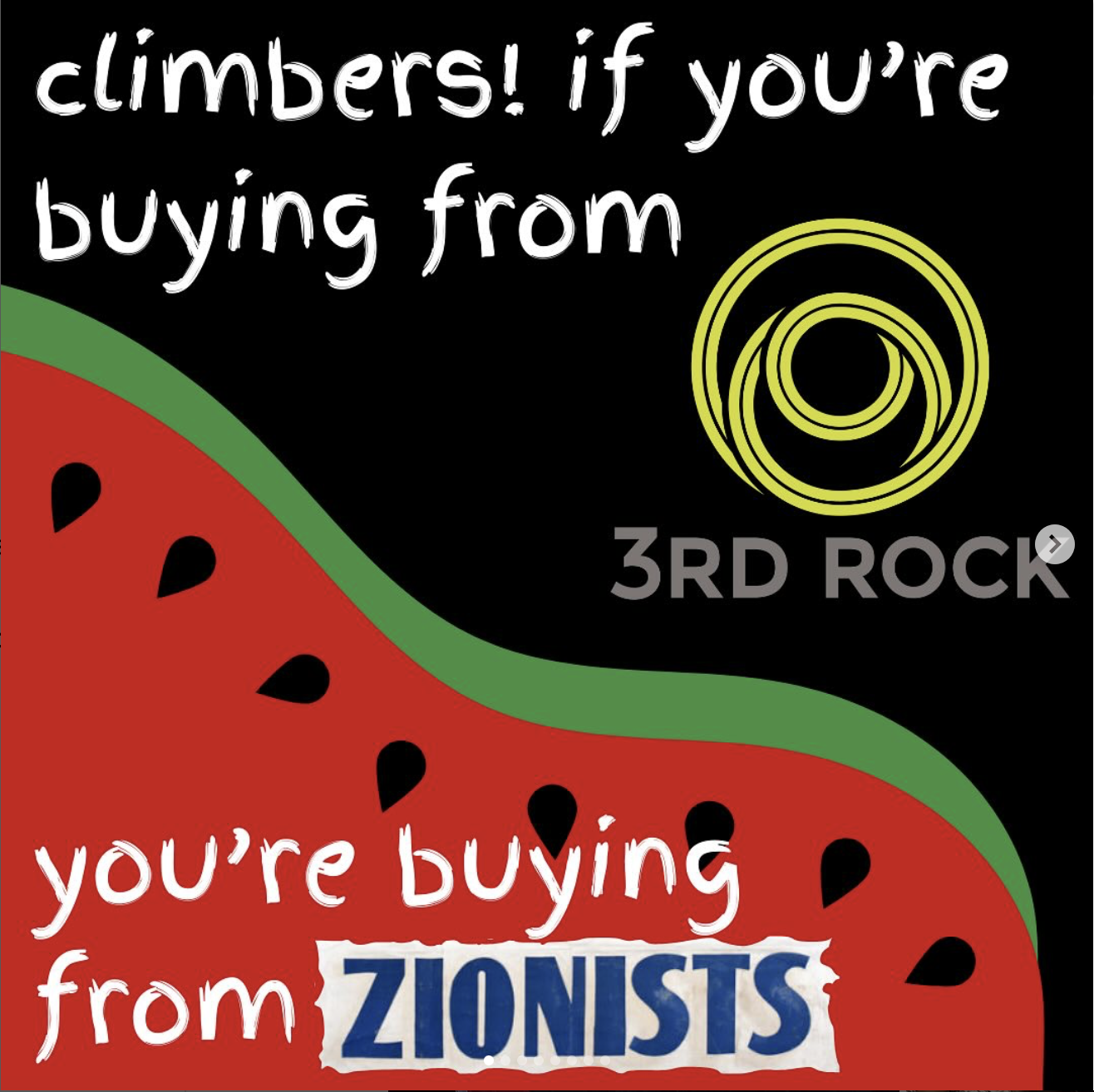In the immediate aftermath of 9/11, it was commonsense, instinct even, for the Left to oppose the individual and collective racist scapegoating of Muslim-identifying people. And yet, what seems obvious in one dynamic of social relations simply isn’t seen as obvious in a comparable one: it is always racist to single out a person or a group on the basis of their negatively racialised ethnicity. Enter the Climbers for Palestine Instagram rant against Guy Mor, the founder of activewear brand, Third Rock, and the call for a boycott: “climbers! if you’re buying from Third Rock, you’re buying from Zionists”.