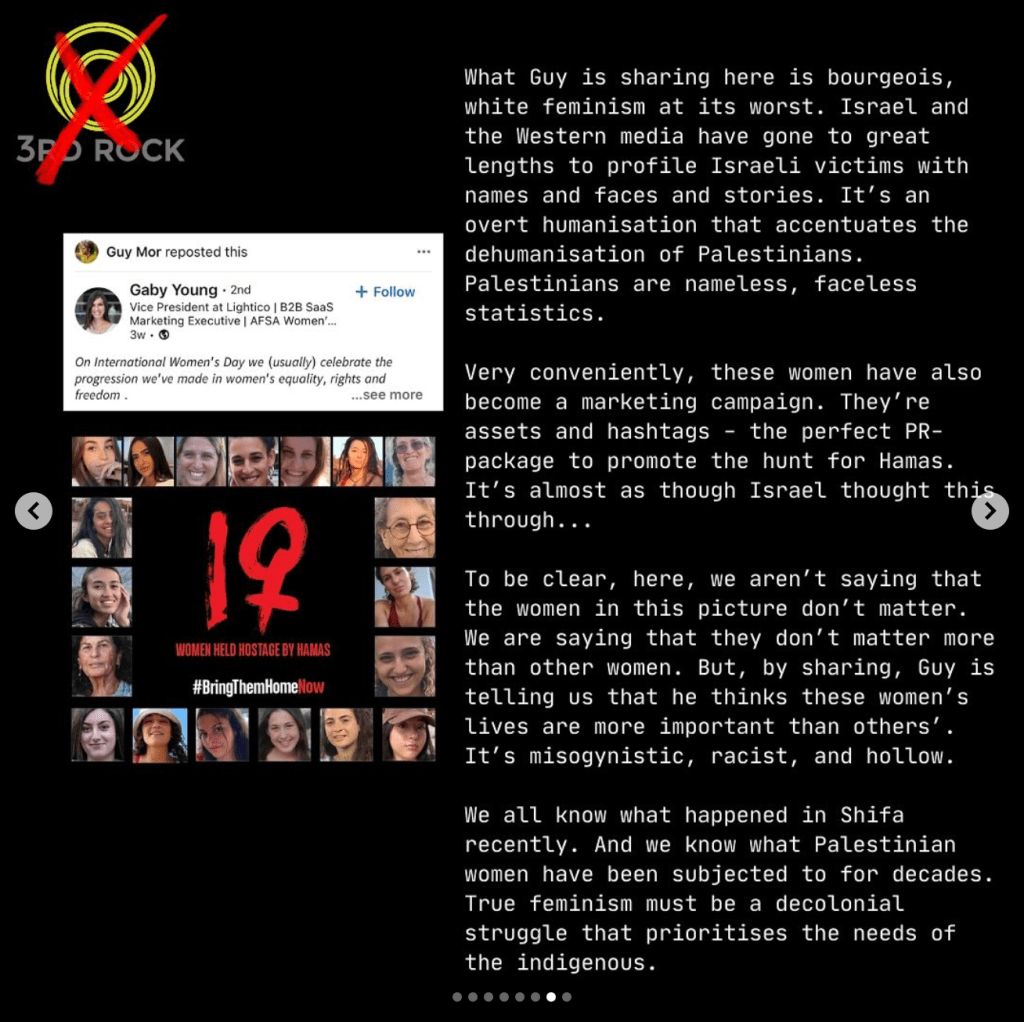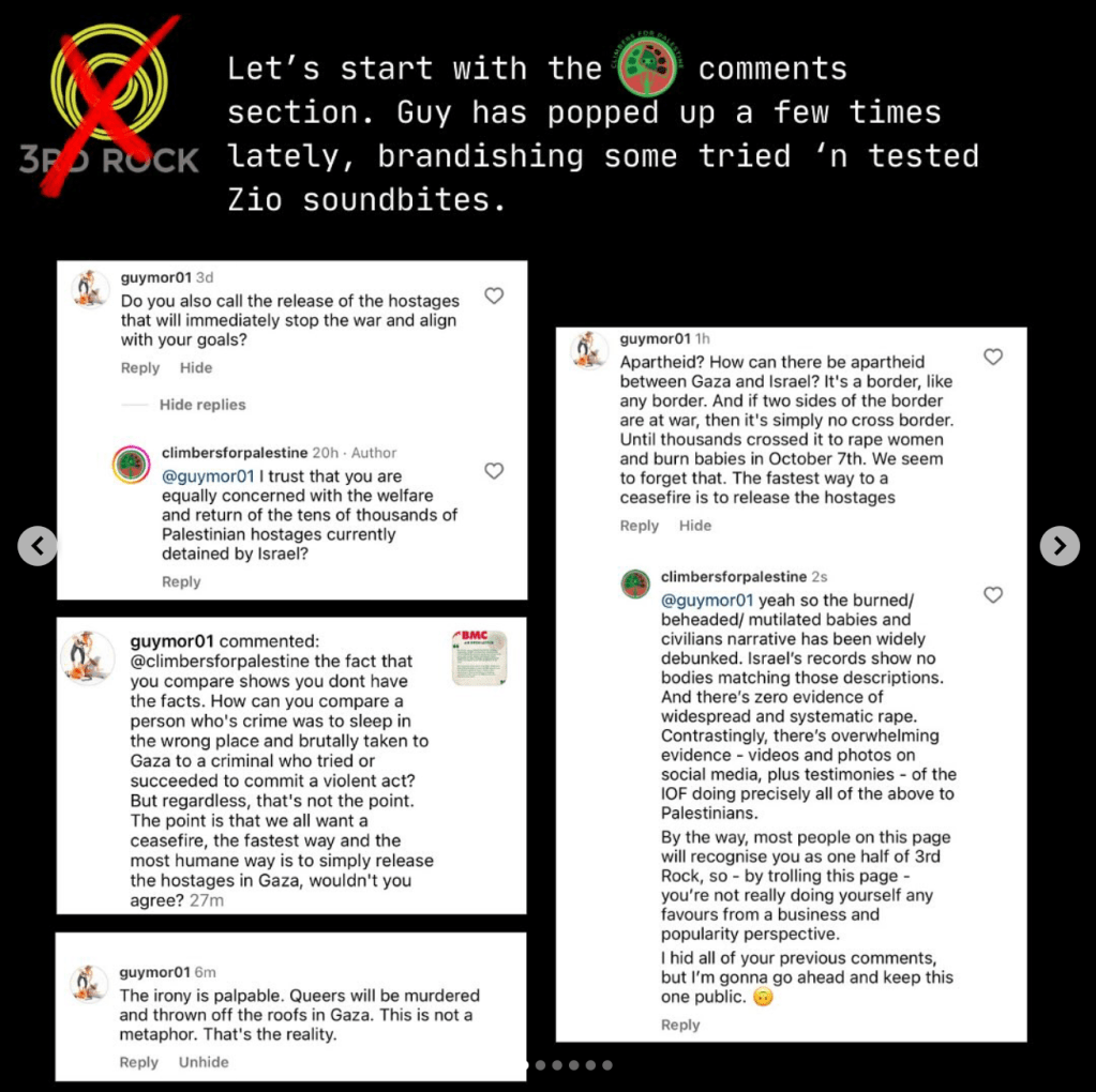 “They called me a Zionist genocide denier, a bloodthirsty baby killer, that I was a member of the ‘IOF’, the ‘Israeli occupation force’. […] I just wrote a couple of respectful comments, and they took them out of context. I never said I support genocide. I think there should be a ceasefire as soon as possible, and my view is that the way to get there is to release the hostages. […] I was called a ‘bloodthirsty baby killer’, ‘ignorant’ and [was told] ‘I know nothing about the conflict (me, who was born in Israel, worked with Palestinians in the West Bank and was a political “left” [supporter] advocating for Palestinian rights). […] I do believe that Palestinians have a right to a state and I do think there are a lot of wrongdoings by Israel in the West Bank…I personally have probably done more to promote the Palestinian cause than a lot of [members of the Climbers for Palestine group]. […] Some [Instagram users] have posted stories about how they can’t be associated with a brand that supports genocide or the suffering of Palestinians. But 3rd Rock has always been about inclusivity and supporting minorities.”
